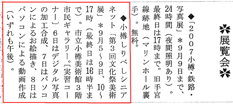 朝日新聞タウン紙に「第3回小樽しりべしシニアネット文化祭美術展」の紹介記事が掲載されました。「記事をクリックすると拡大します」