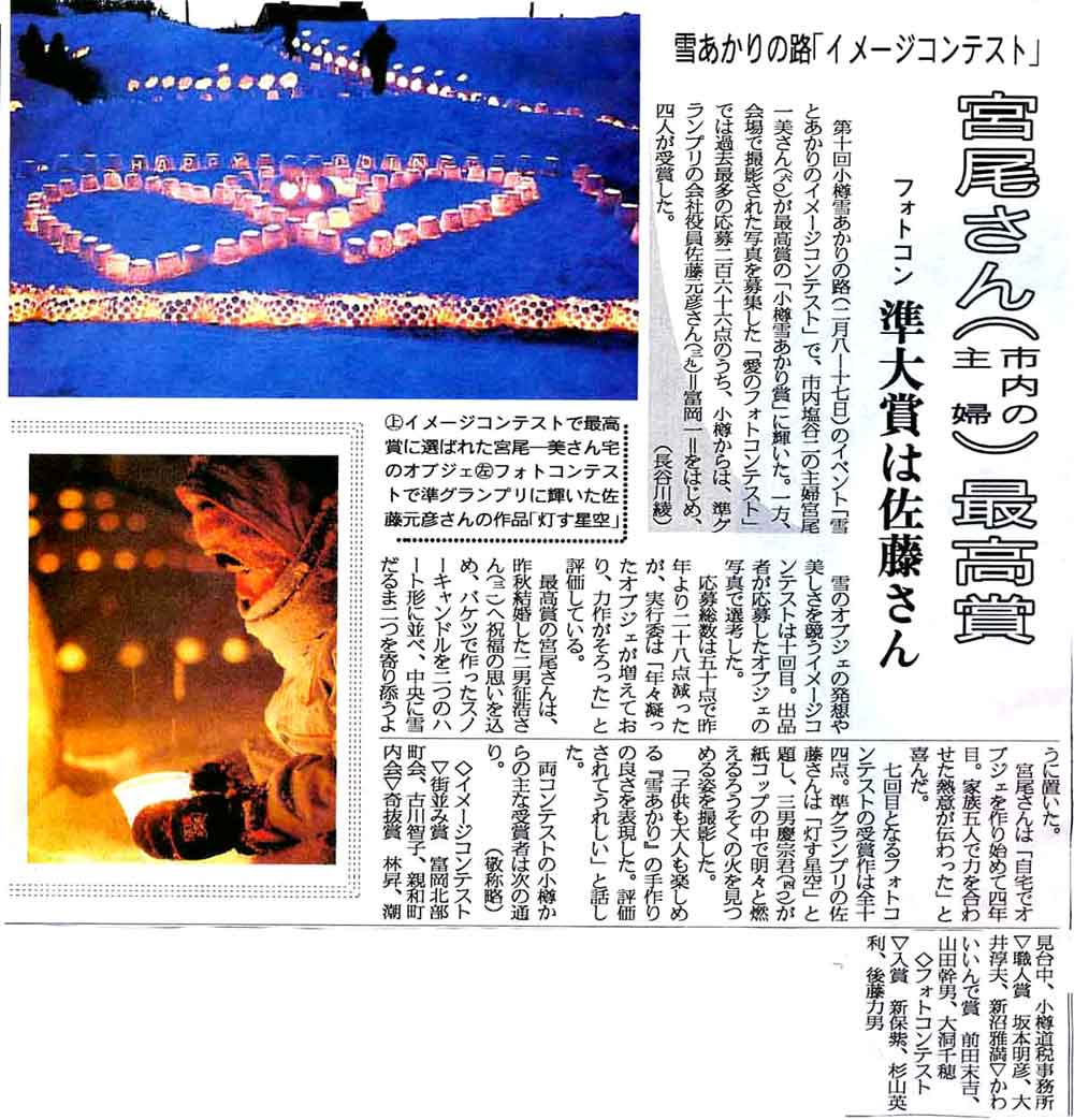 2008年4月1日(火)北海道新聞{小樽後志版)に「第10回小樽雪あかりの路」フオトコンテスト「雪とあかりのイメージコンテスト」において最高賞の「小樽雪あかり賞」に輝いた記事が掲載されています。宮尾様おめでとう御座あいました。「記事をクリック拡大して御覧ください」