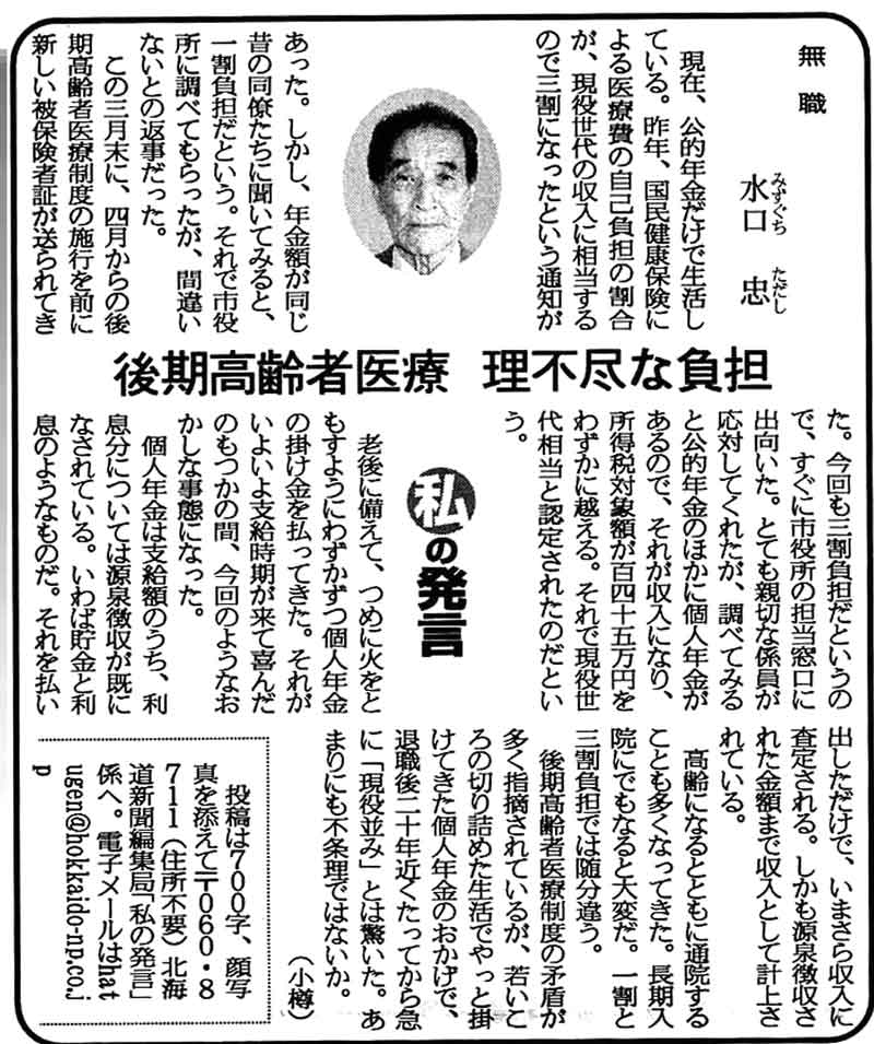 本日の北海道新聞「全道版」に投稿された、会員の水口忠様の記事が掲載されていますので紹介します。