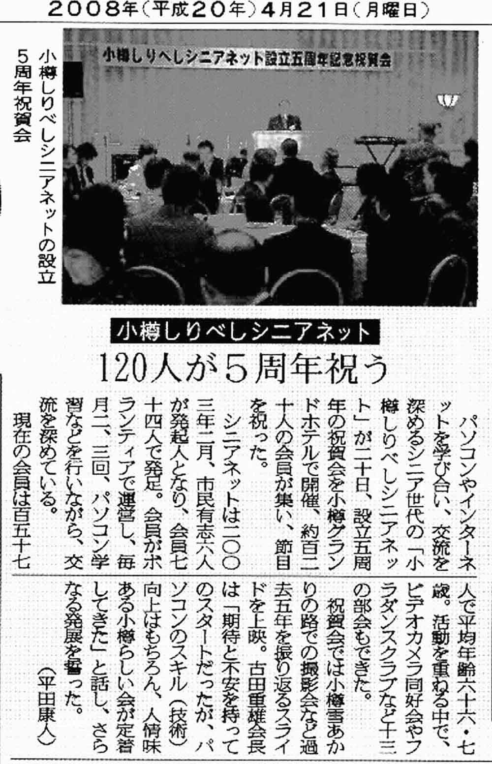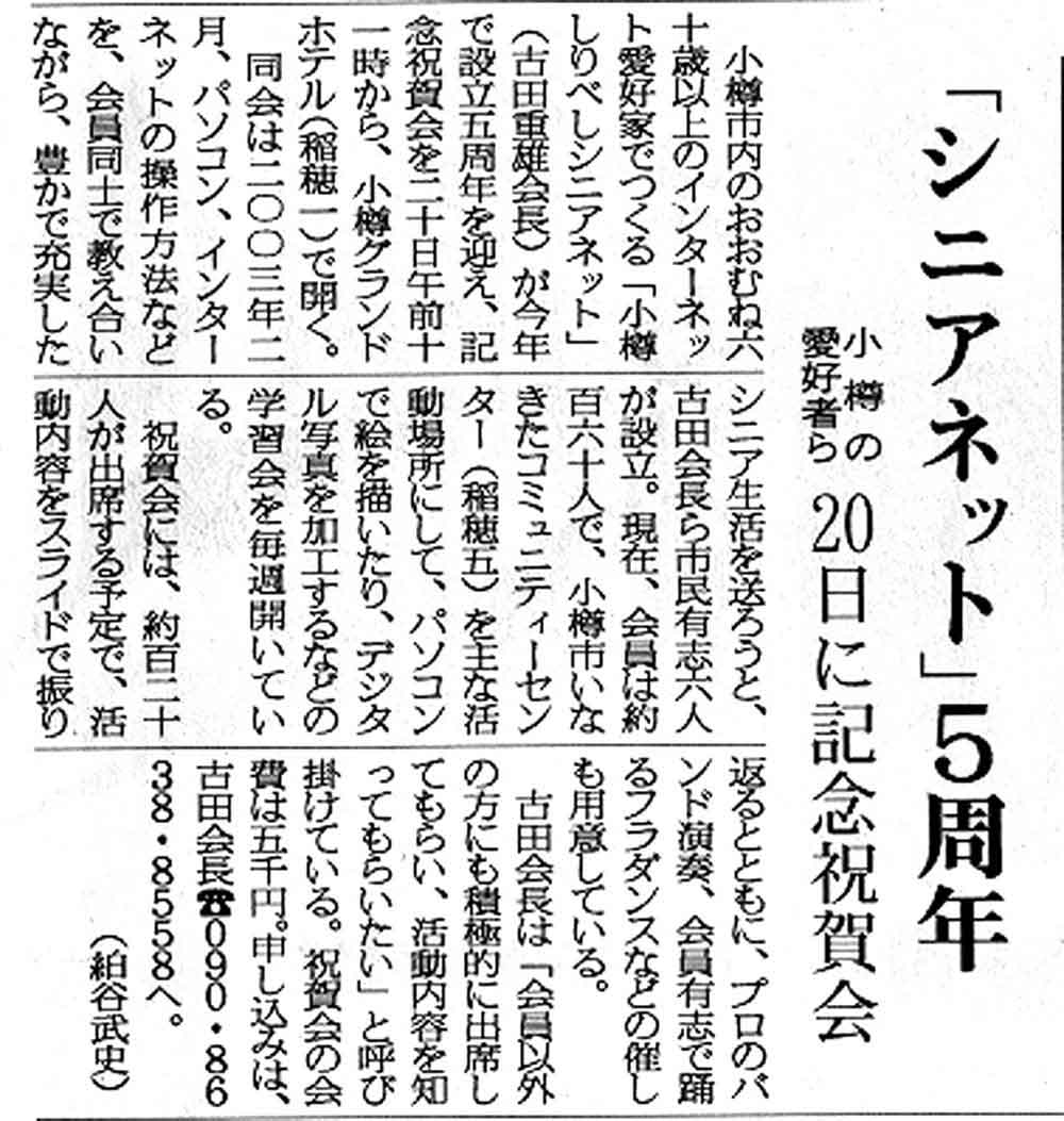 20年4月9日北海道新聞(小樽版)に来る20日に実施される小樽しりべしシニアネット設立5周年記念祝賀会の予告記事が掲載されていますので紹介します。「クリックすると記事は拡大します」