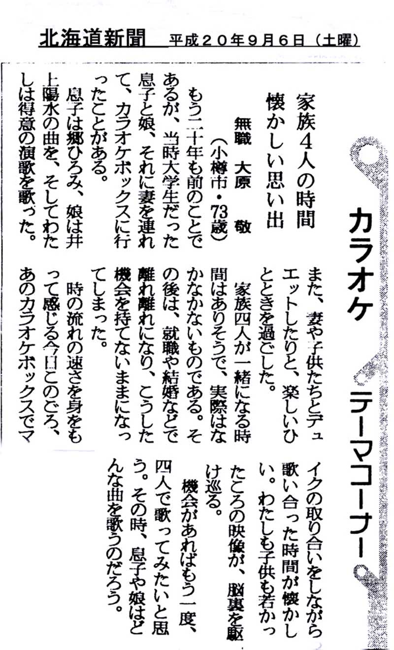 OSS会員57番大原 敬様の北海道新聞投稿記事「家族4人の時間、懐かしい思い出」の掲載記事を紹介します