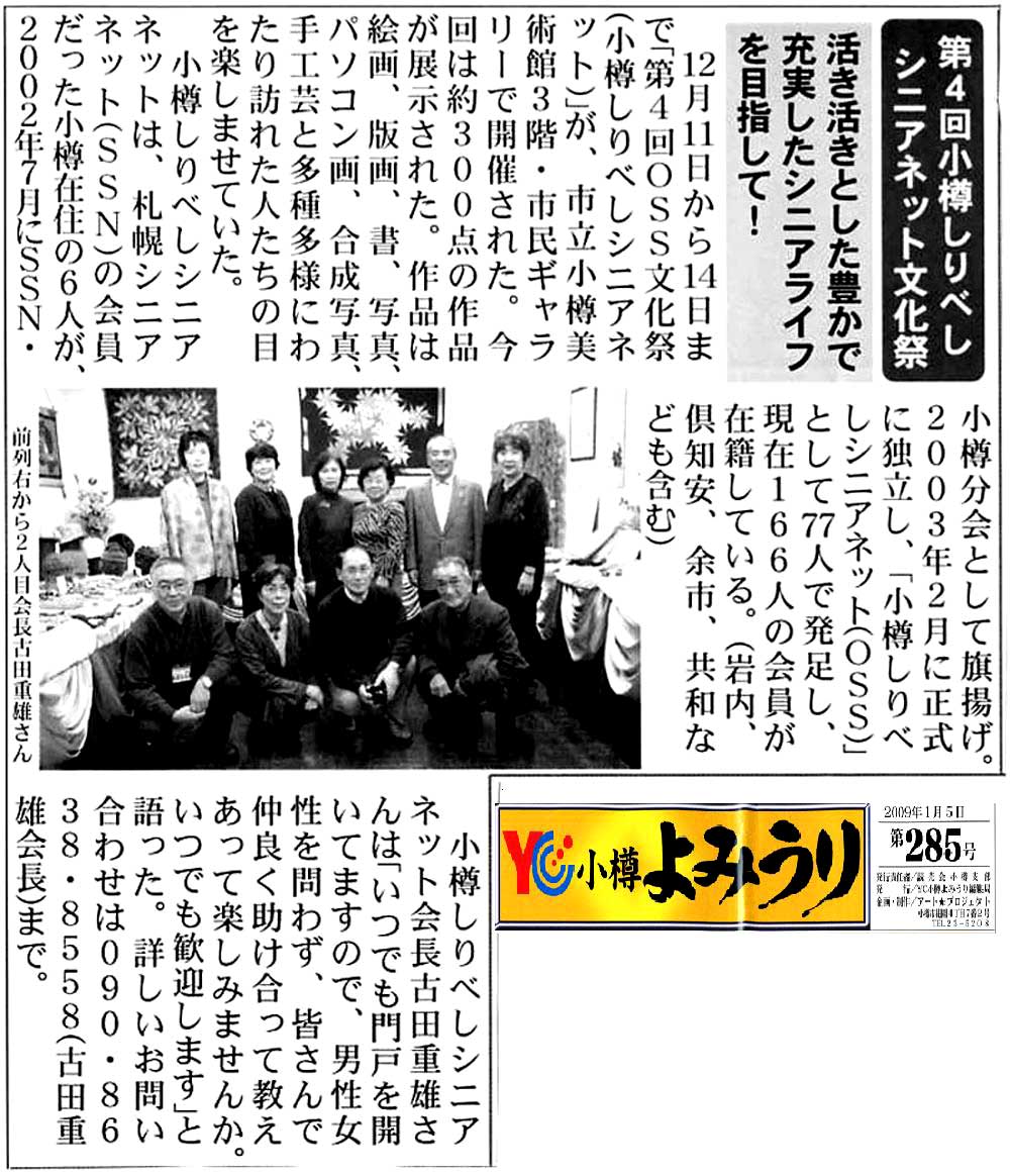 昨年の12月12日〜14日市民ギャラリーで実施したOSS文化祭美術展の取材記事が読売新聞の別刷紙「小樽よみうり285号」に掲載されましたので紹介します。記事はクリックすると拡大します。