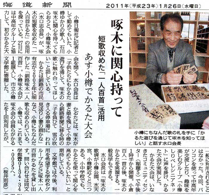 小樽啄木会(会長 水口忠氏)が小樽文学館に寄贈の、啄木の短歌を集めた1人100首も使用する、恒例のOSSのカルタ会開催の紹介記事が北海道新聞(小樽版)に掲載されているので紹介します。