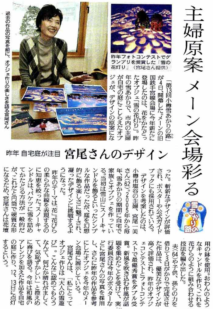 今朝の読売新聞(小樽版)のトップ記事に「今年度の小樽雪あかりの路」メーン会場「旧手宮線跡」に昨年度グランプリを獲得された会員の宮尾一美さん制作の【雪の花あかり】が採用された記事が大きく掲載されていますので紹介します。
