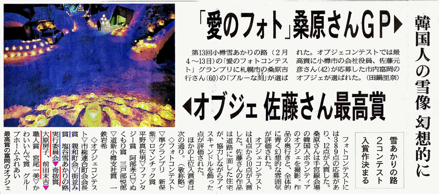 平成23年2月4〜13日に実施された第13回小樽雪あかりの路の「愛のフォトコンテスト及びオブジエコンテストの入賞者が発表され、オブジエコンテスト応募数41点の中からOSS会員の大原房子様が奇抜賞、宮尾一美様が職人賞の栄誉を獲得された記事が北海道新聞に掲載されています。この記事を読めない方の為に紹介します。※記事をクリックすると拡大しますこの記事は池端恭爾氏から送られた物です。