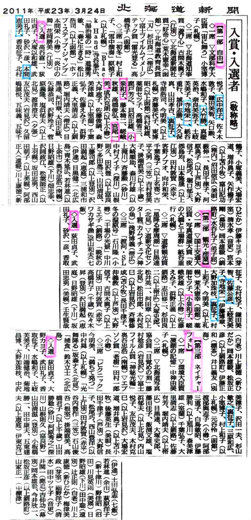 ◎ 関係部分の抜粋第58回写真道展の入賞入選者が北海道新聞紙上で発表され OSS会員の小泉和様、宮尾一美様のほかSSN会員本間恵美子様、広中洋子様、裏征子様、寺地栄一様、佐藤公彦様、大竹勝様の各氏が夫々の部門で入選されています。入選された皆様本当におめでとう御座います。※ 記事はクリックすると拡大します。 又記事を下方にスライドしながらご覧下さい。