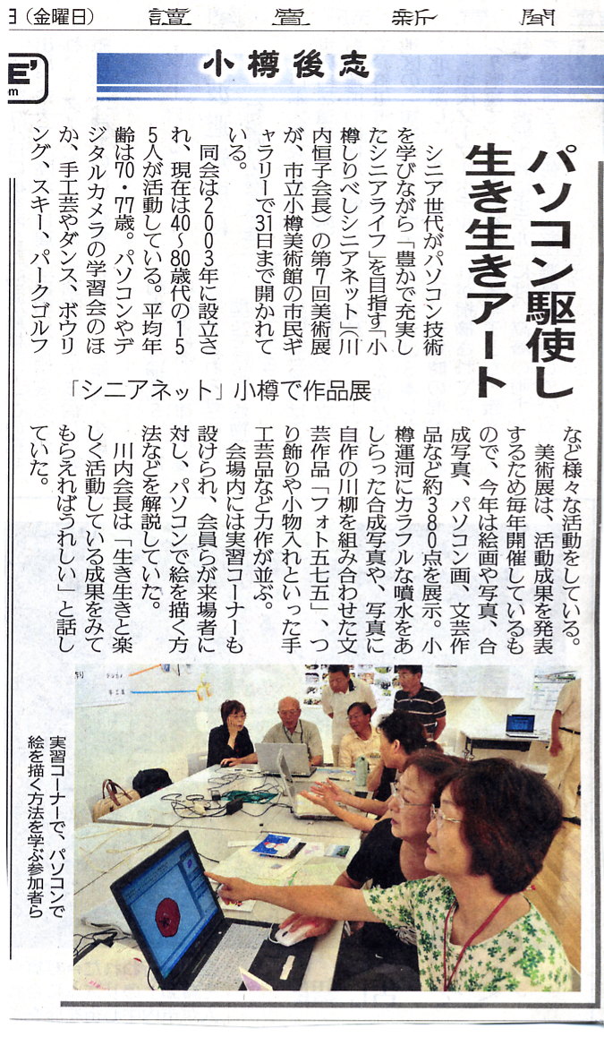 リニューアルされた小樽美術館において、平成23年7月27日(水)より7月31日(日)まで「OSSの第7回美術展を開催、28日に読売新聞社の取材を受けた。その記事が29日朝刊(小樽版)に掲載されたので記事を読めない方のために紹介します。※ 記事はクリックすると拡大します。