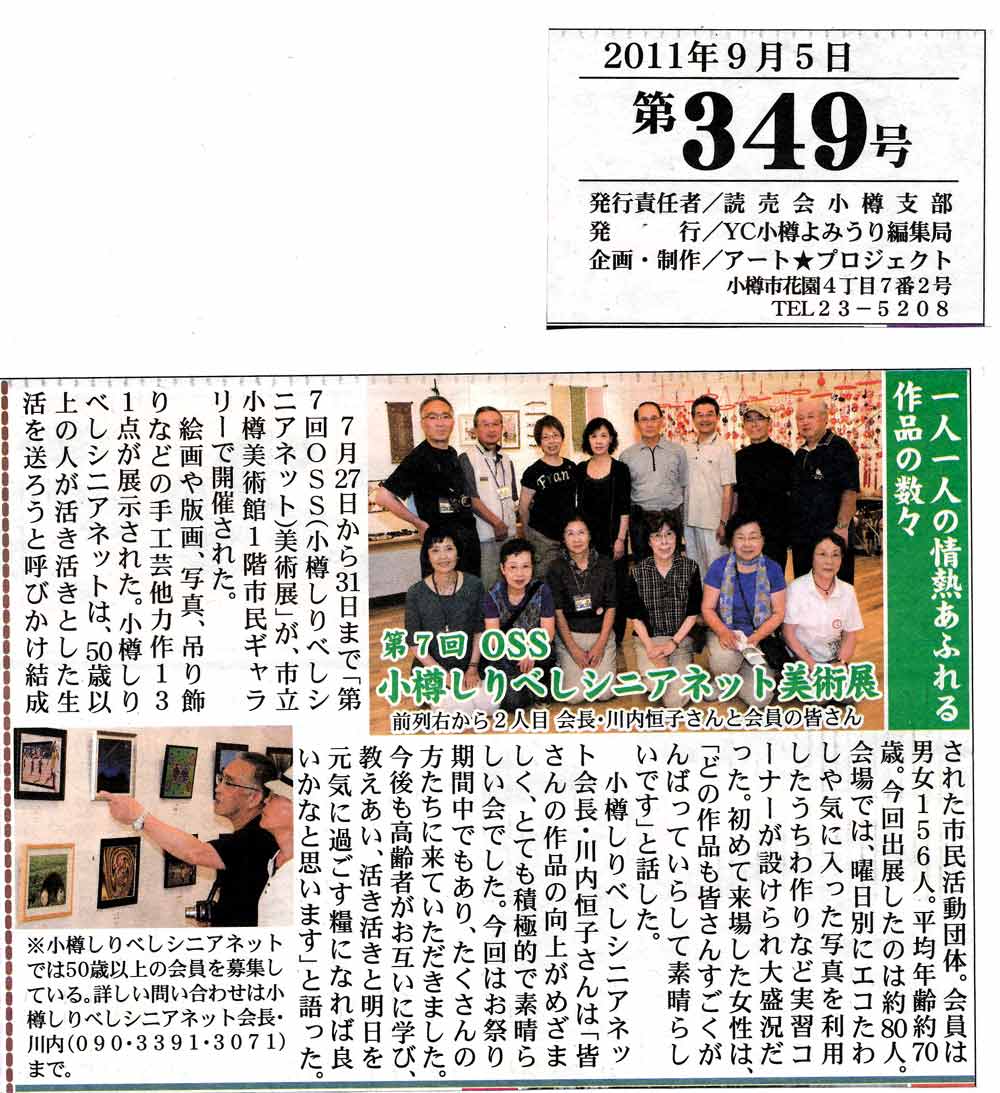 7月末に実施した「第7回美術展」を取材した記事が9月5日発行の読売新聞の折込紙「小樽よみうり」に報道されていますので紹介します。※ 記事はクリックすると拡大します。この記事は宮尾一美さんからいただいたものです。
