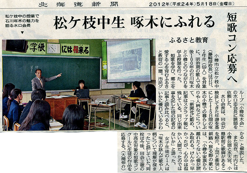 2012年5月18日(金)北海道新聞に会員の水口忠氏が松ヶ枝中学校で石川啄木の講義をされた記事が掲載されていました。 記事はクリックすると拡大します。この記事は池端恭爾氏から送られたものです