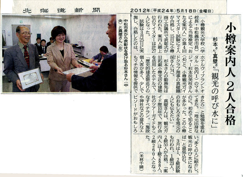 2012年5月18日(金)北海道新聞OSS会員の真壁睡渓氏が小樽観光案内人のマイスター試験に合格され小樽市長から表彰された記事が掲載されていましたので紹介します。記事はクリック拡大しスライドさせながらご覧下さい。この記事は池端恭爾氏から送られました。