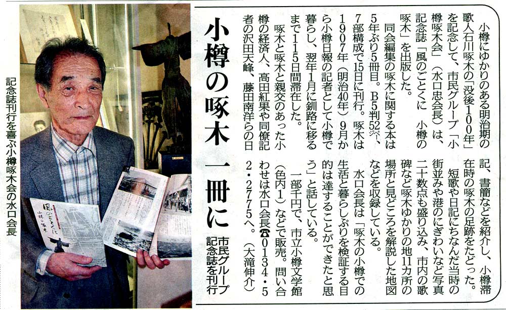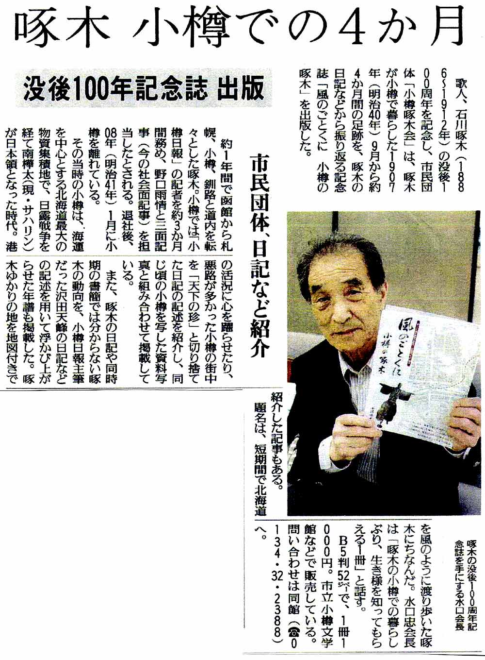 2012年05月26日(土曜)読売新聞朝刊(小樽しりべし版)に小樽啄木会(会長水口 忠さん)が出版した啄木没後100年記念誌「風のごとく」の記事が掲載されているので紹介します。※記事をクリック拡大しスライドさせながら覧くださいこの記事は川横康子さんからの提供です。