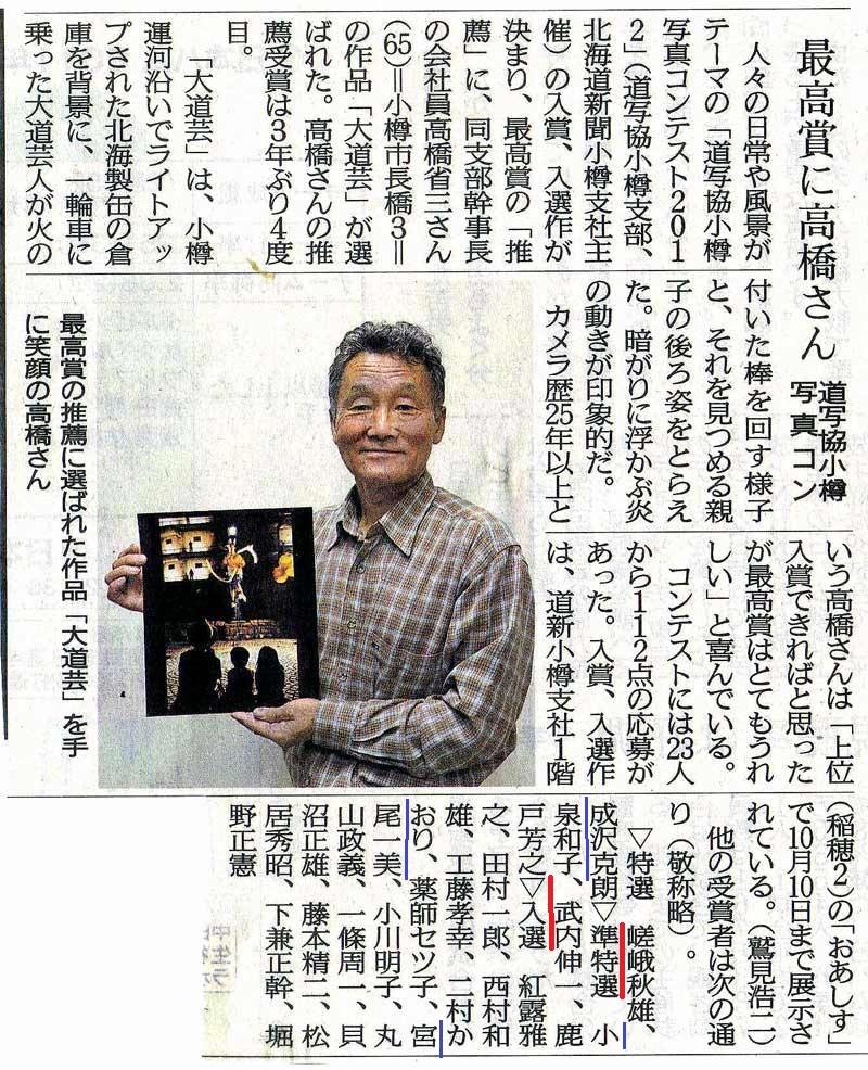 道写協小樽写真コンテスト2012の入選 入賞写真の結果が本日の北海道新聞で発表され、会員の「小泉和子さん」が準特選。「宮尾一美さん」が入選です。 お二人の入賞 入選 おめでとう御座いいます。※ 記事をクリックすると拡大します。この記事は池端恭爾氏からの紹介です