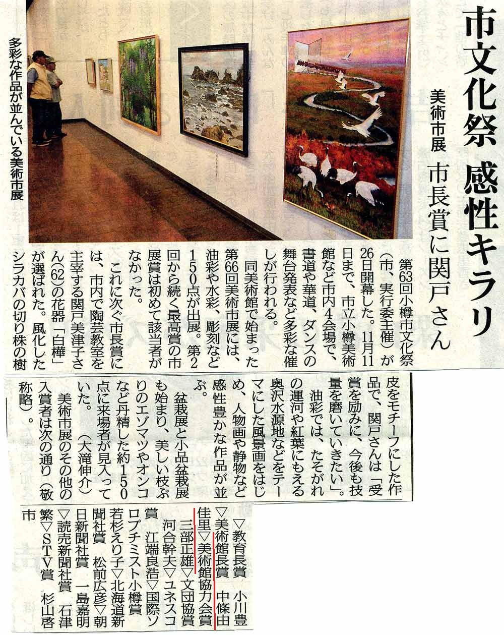 今日の北海道新聞に第63回小樽市文化祭として開催された中の「第66回美術市展」において、会員の三部正雄氏が「美術館協力賞」を受賞された記事が報道されていたので紹介します。※ 記事はクリックすると拡大しますこの記事は川内恒子さんから寄せられたものです。