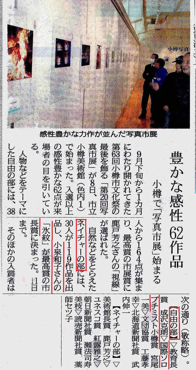 本日の北海道新聞(小樽版)に、第60回小樽市文化祭の中の「第20回市写真展」において小泉和子さんが「ネイチャー部門で市長賞」宮尾一美さんが「自由部門で国際ソロプチミスト賞」に入賞された記事が出ていましたので紹介します。※記事をクリック拡大スライドさせながらご覧下さい。この記事は池端恭爾さんから寄せられたものです。