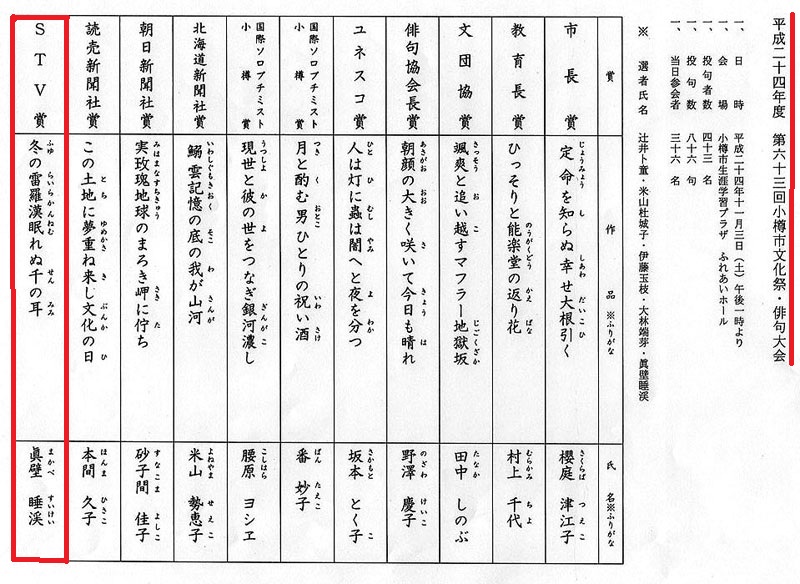 平成24年度小樽市文化祭の俳句の部で、STV賞を真壁さんが受賞されました。 又川柳の部の読売新聞社賞に大原さんが入賞されていますが次ページにて紹介します。この記事は小樽ジャーナルに掲載されたものです※記事はクリック拡大 スライドさせながらご覧ください。記事をクリック拡大 スライドさせながらご覧ください。