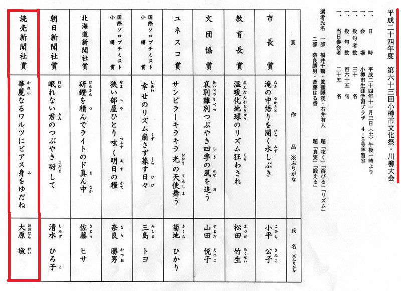 平成24年度小樽市文化祭 川柳の部で読売新聞社賞を大原 敬さんが受賞されました。記事は小樽ジャーナルに掲載されたものです。※ クリック拡大し、スライドさせながらご覧ください。