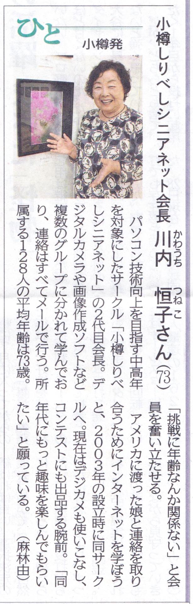 7月29日北海道新聞朝刊小樽後志版のコラム『人』に川内会長が紹介されています。