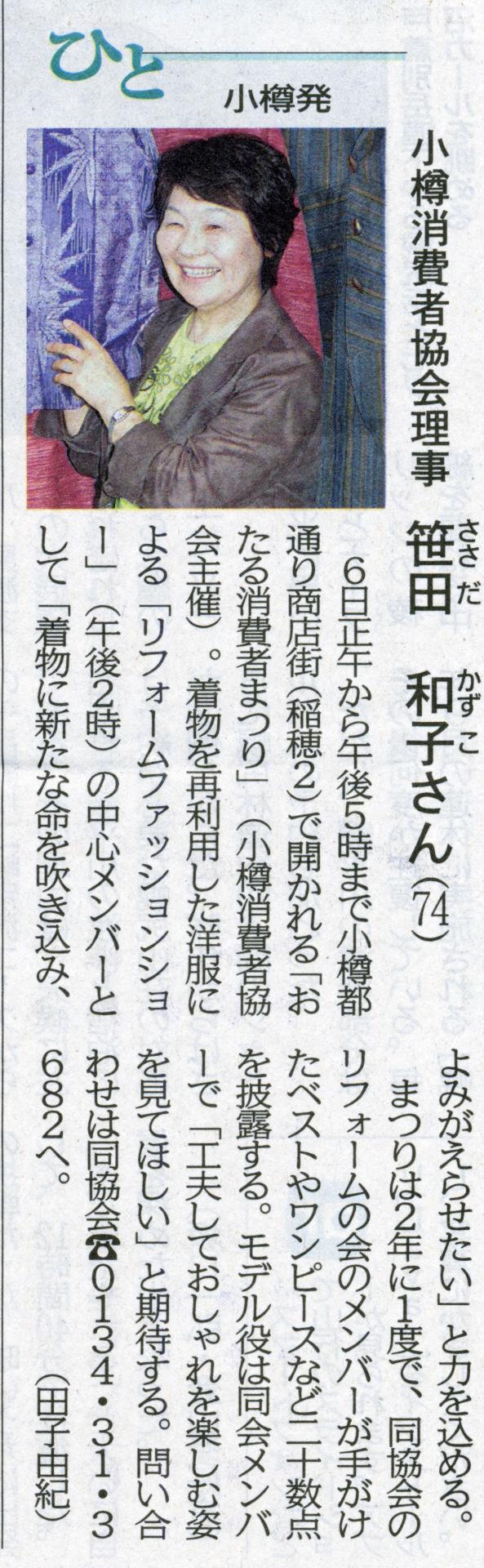 9月5日北海道新聞朝刊小樽後志版のコラム『ひと』に笹田副会長が紹介されています。