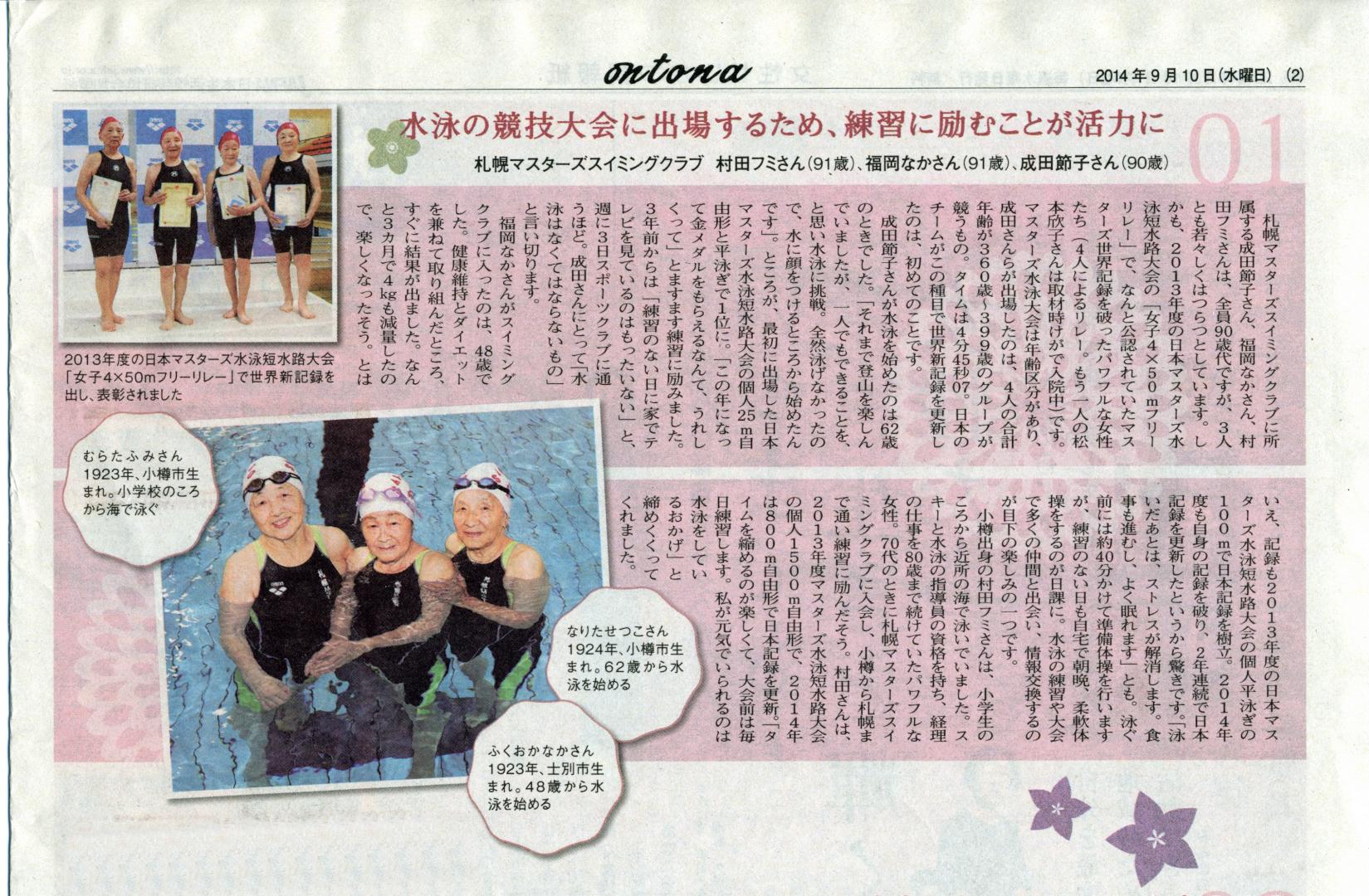 女性せいかつ情報誌『ontona』(9月10日)に村田フミさんが紹介されています。『泳いたあとは気分爽快』との事です。
