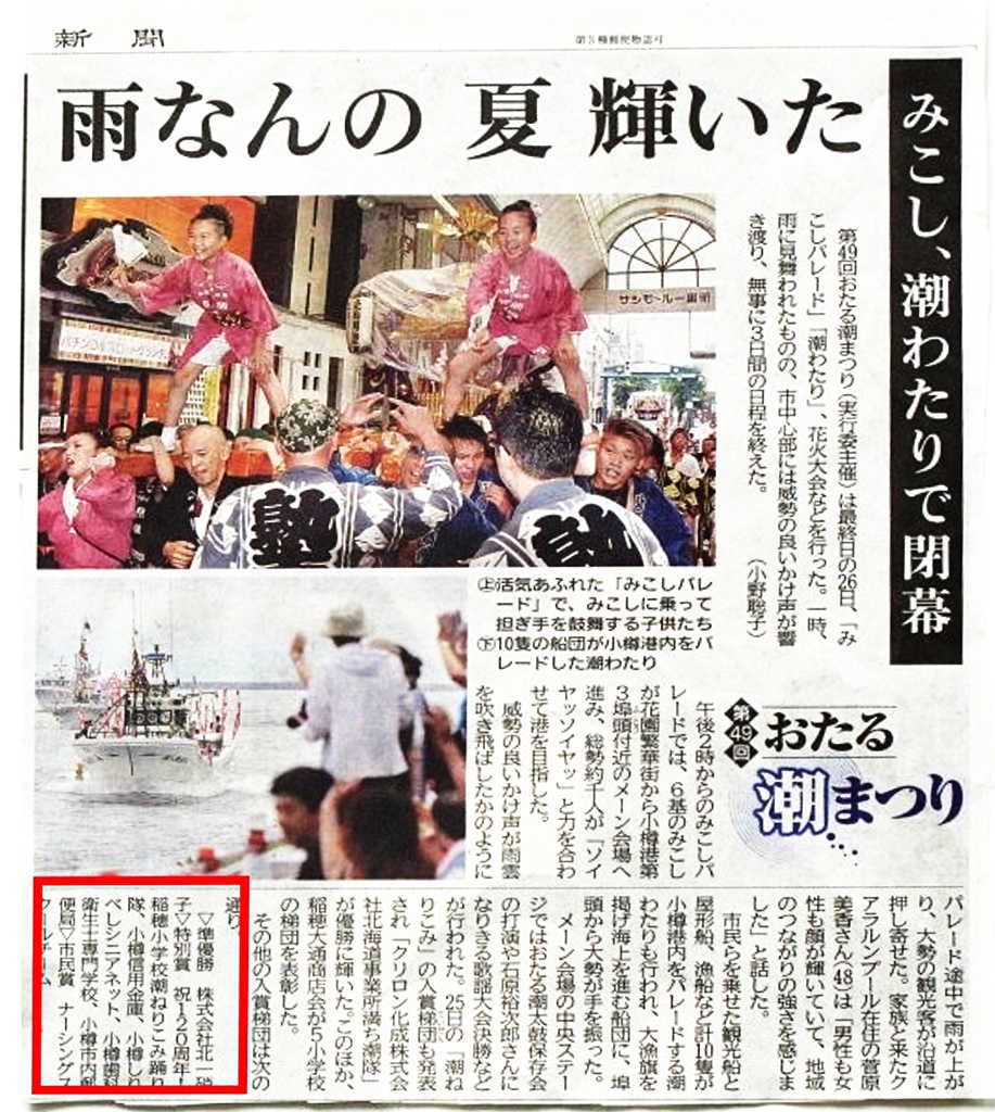 7月25日に行われた潮ねりこみの新聞記事と審査員特別賞の賞金です。赤枠の中の入賞悌団にOSSの名前が載ってます。この記事は平成27年7月26日夕刊に掲載されました。