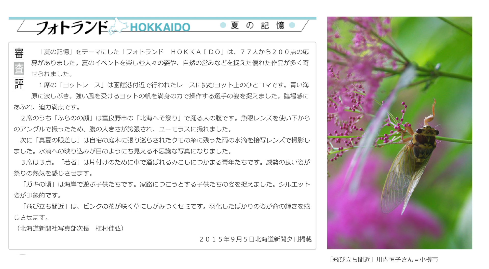 北海道新聞社が主催するフォトランドHOKKAODO『夏の記憶』で川内さんの『飛び立ち間近』が3席に入選しました。(2015年9月5日夕刊に掲載)