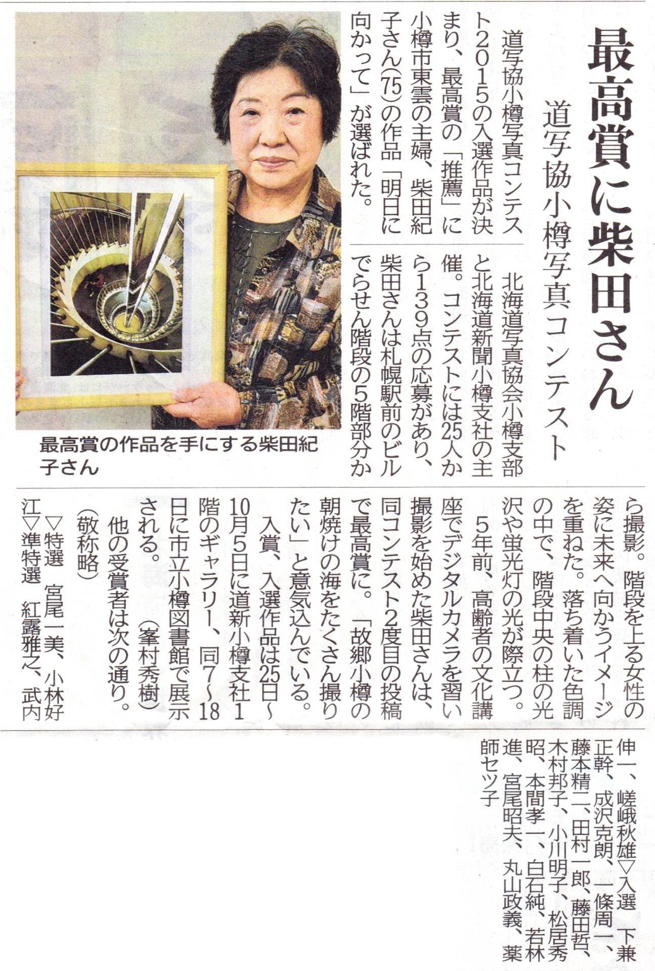 道写協小樽写真コンテスト2015の最高賞に柴田紀子さんの作品が選ばれました。他に特選を宮尾一美さん、入選を木村邦子さんが受賞しました。(2015年9月25日小樽後志版)