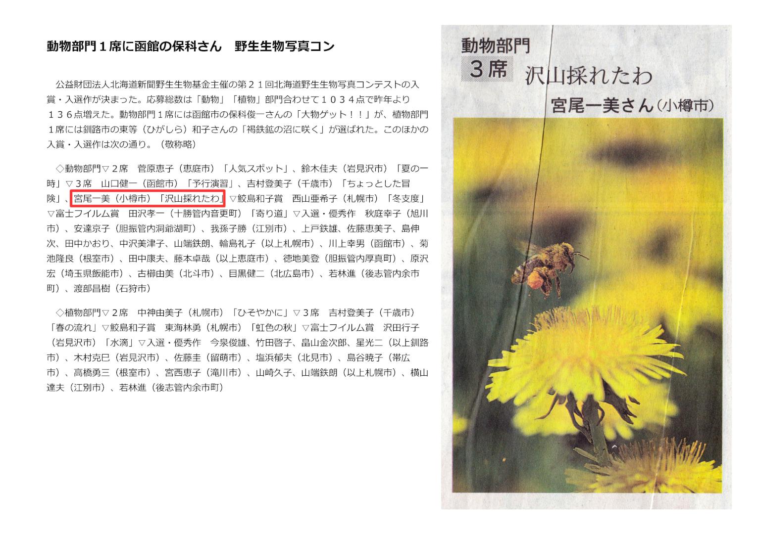 第21回北海道野生生物写真コンテストで宮尾さんの『沢山採れたわ』が動物部門で3席に入賞しました。審査委員長の講評ミツバチについた花粉のかたまりの大きさに目が奪われる。しかも、小さな昆虫をシャープに撮ることに成功している。私たちが目を向けることの少ない世界に気づかせてくれる作品だ。