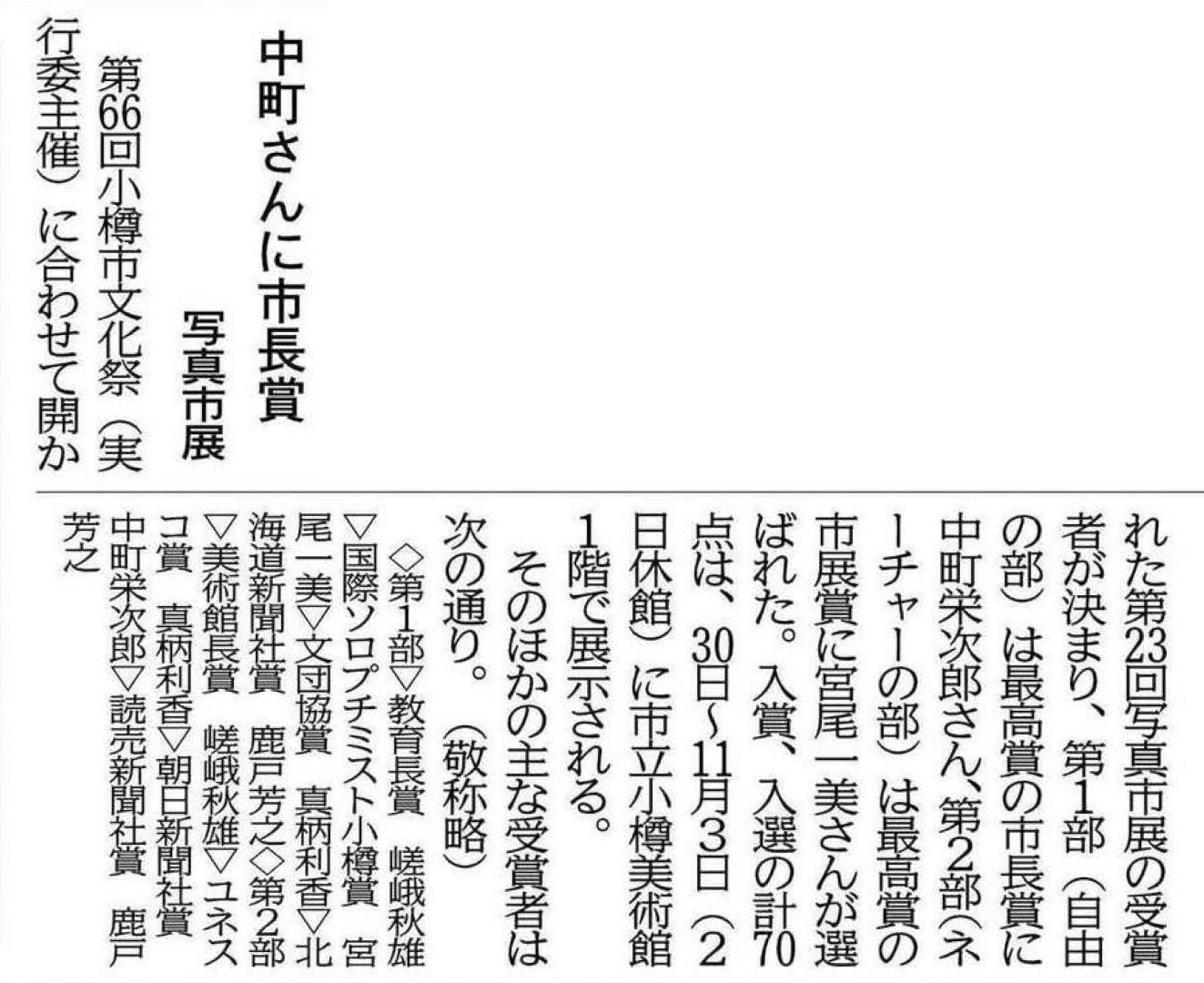 第23回写真市展第2部(ネーチャーの部)で最高賞の市展賞に選ばれました。また第1部(自由の部)でも国際ソロプチミスト小樽賞に選ばれています。10月29日北海道新聞小樽・後志版(朝刊23面)に掲載されました。