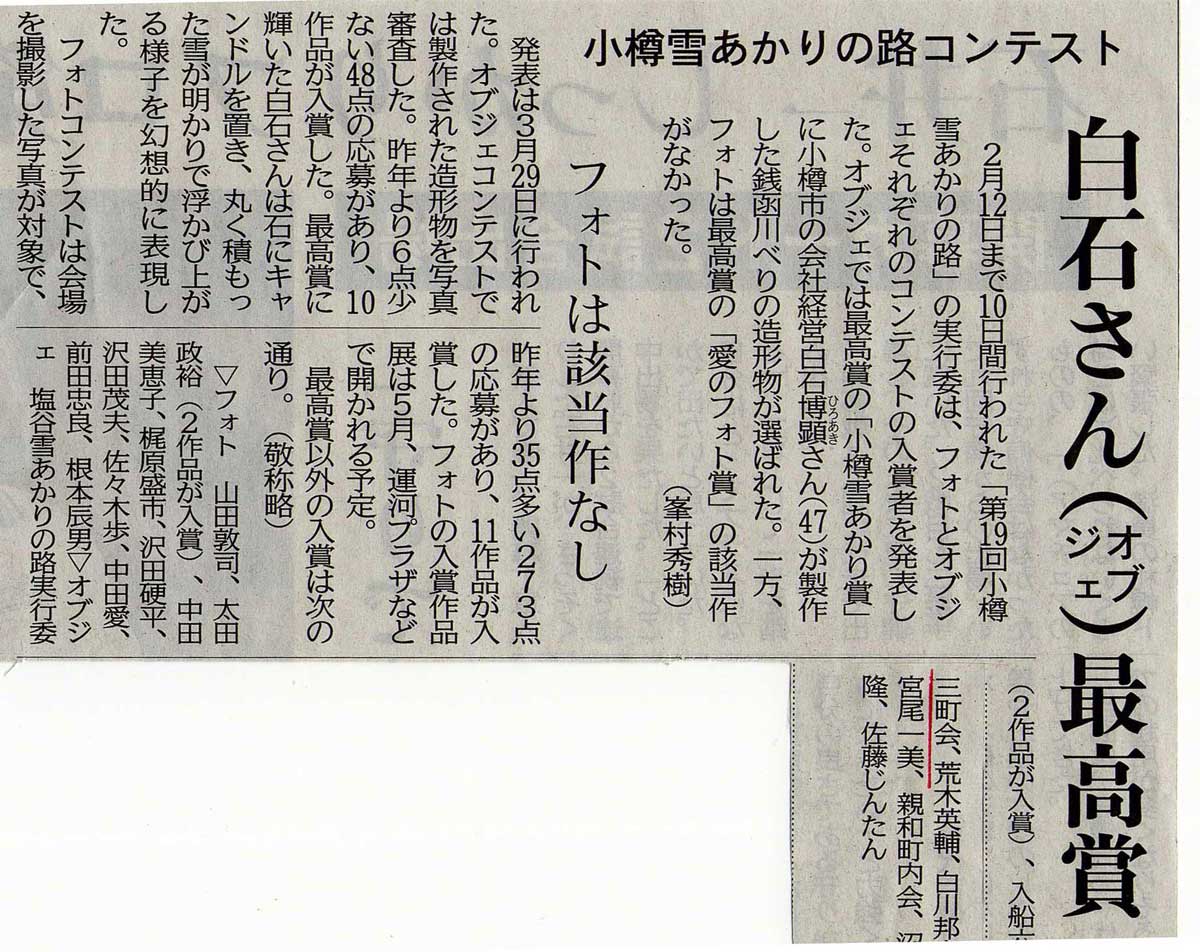 小樽雪あかりの路コンテストでオブジェの部門で宮尾一美さんが入賞されました。2017年4月4日北海道新聞朝刊に掲載されました。