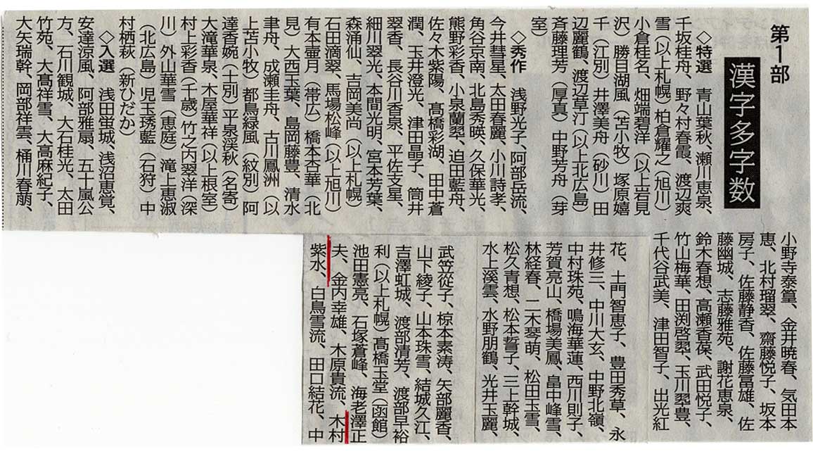 第58回北海道書道展で、会員の木村邦子(木村紫水)さんが第1部「漢字多字数」部にて入選された記事が掲載されました。4月5日北海道新聞朝刊24面に掲載されました。