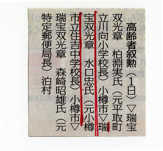 2017年10月1日北海道新聞朝刊に、高齢者叙勲の発表があり、水口忠さんが、「瑞宝双光章」を受賞された記事が掲載されました。