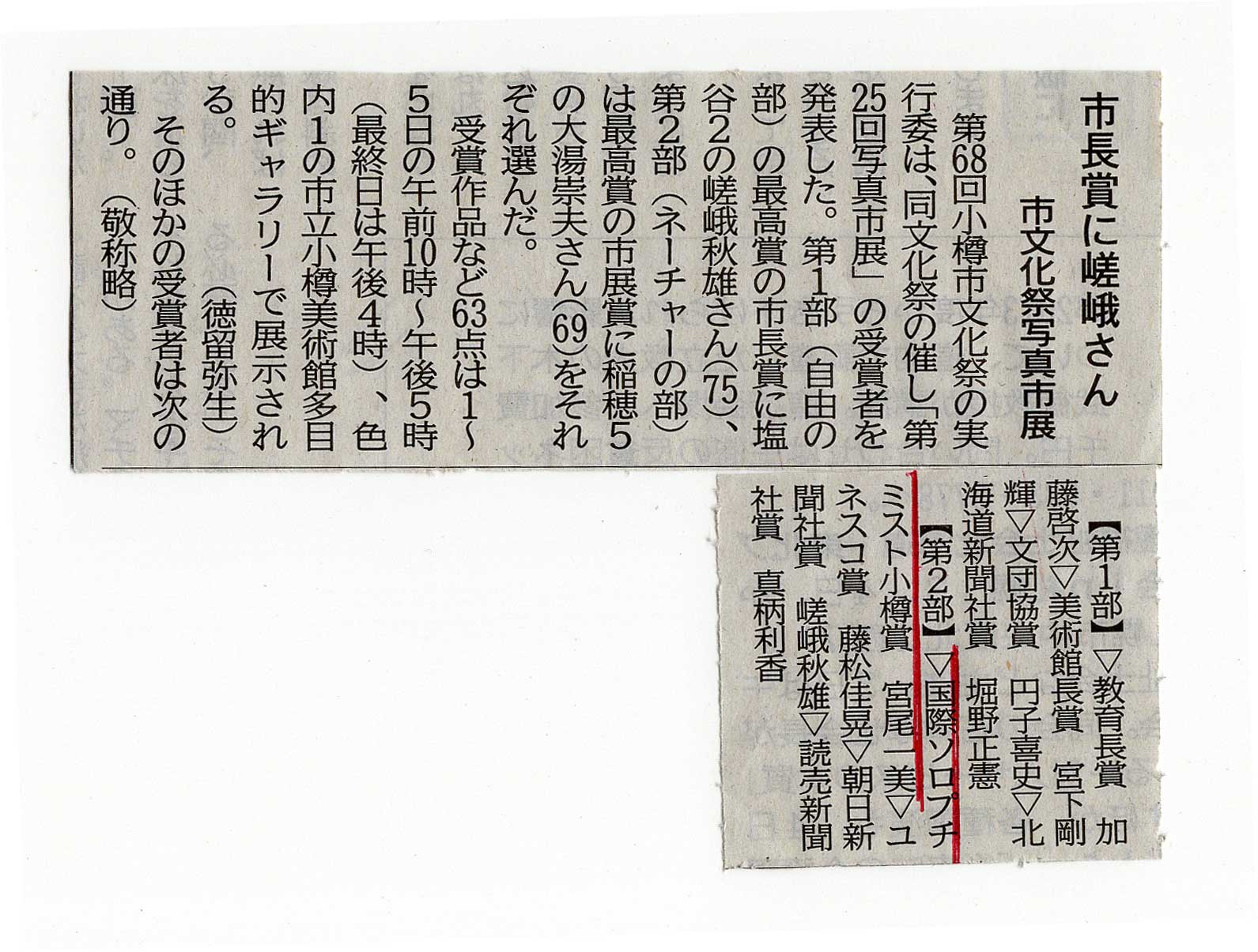 「第25回写真市展」の発表があり、宮尾一美さんが「国際ソロプチミスト小樽賞」受賞の記事が掲載されました