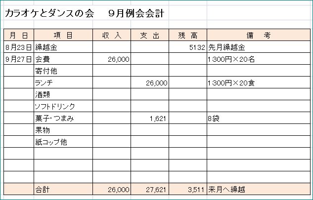 続 9月のカラダン ステップも軽やかに・・・ 投稿者古田悦子 投稿日2016/09/28(Wed) 19:06 No.633 続 9月のカラダン 皆さん楽しそうに歌っています。 投稿者古田悦子 投稿日2016/09/28(Wed) 19:10 No.634 会計報告 部の残金も少なくなったので、部費からはおつまみ・お菓子類のみを買うことにし、飲み物は各自で飲みたいものをもってきて頂くことになりました。今月はそれらで1621円使いましたので、残額は3511円となりました。 投稿者宮尾一美 投稿日2016/09/28(Wed) 20:44 No.635