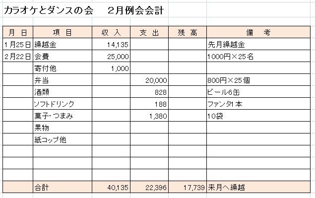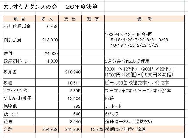 カラオケ三昧 参加者25名カラオケは最後まで途切れる事無く、もう少し歌いたかったくらい楽しい一日でした。いつもカラオケの担当さん、ありがとうございます。 投稿者松本康志 投稿日2015/02/23(Mon) 19:02 No.534 ダンスタイム 投稿者松本康志 投稿日2015/02/23(Mon) 19:03 No.535 ダンスタイム 投稿者松本康志 投稿日2015/02/23(Mon) 19:05 No.536 ダンスタイム 投稿者松本康志 投稿日2015/02/23(Mon) 19:07 No.537 会計 2月例会は25名の参加で行われました。会場費に充てるお弁当を2万円で、飲み物を1016円で、お菓子を1380円で揃えました。結果、今月は3604円黒字になりましたので今までの繰越金と合わせ17739円を来月に繰り越します。 投稿者宮尾一美 投稿日2015/02/23(Mon) 20:49 No.538