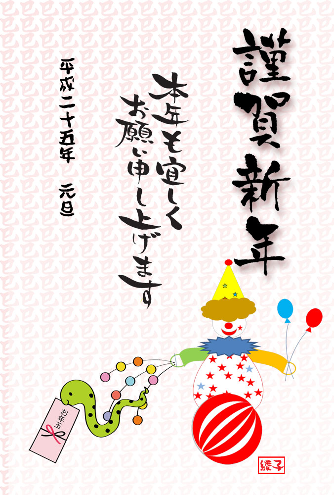 Re: お年始 皆さんあけましておめでとうございます背景「巳」をパターンに保存し、塗りつぶしです、ピエロはワードで描いてみました。 投稿者松本 綾子 投稿日2013/01/01(Tue) 14:37 No.221