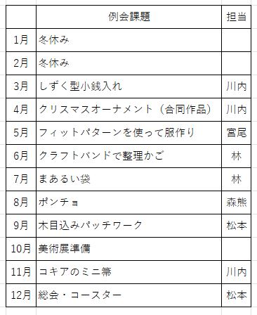 趣味の多い方が沢山いますので、会員の中から順次講師をお願いし、ファスナーブローチ、布草履、鍋帽子、古い着物で小物入れ袋、裁縫箱、マフラーなどを作り、和気あいあいと楽しいクラブです、興味のある方はいつでも入部大歓迎です。