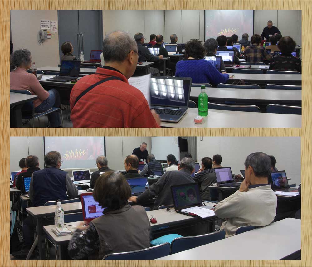講演会 そろそろ始まる前のひと時 投稿者川内恒子 投稿日2018/03/25(Sun) 00:38 No.172 講演会 皆さん真剣に聞いています。 投稿者川内恒子 投稿日2018/03/25(Sun) 00:40 No.173 パソコンクラブ総会 講演に引き続き3時からクラブ総会 27人の出席者29年度の反省と活動状況に引き続き 30年度の活動について話し合う。 投稿者川内恒子 投稿日2018/03/25(Sun) 00:46 No.174