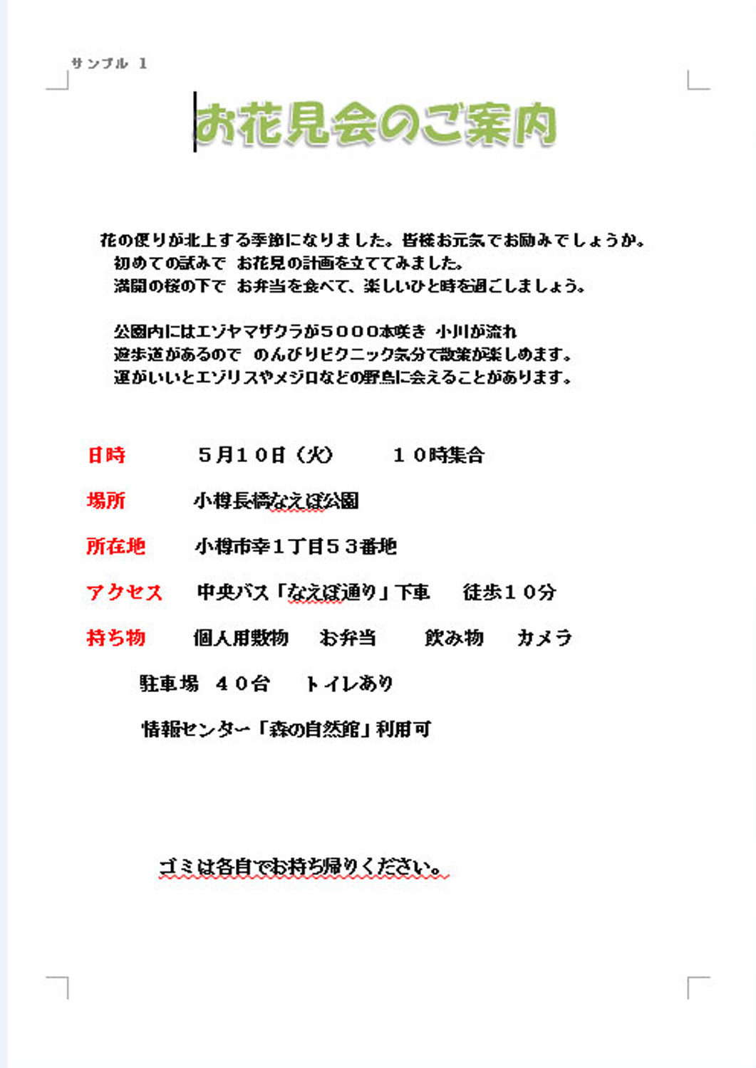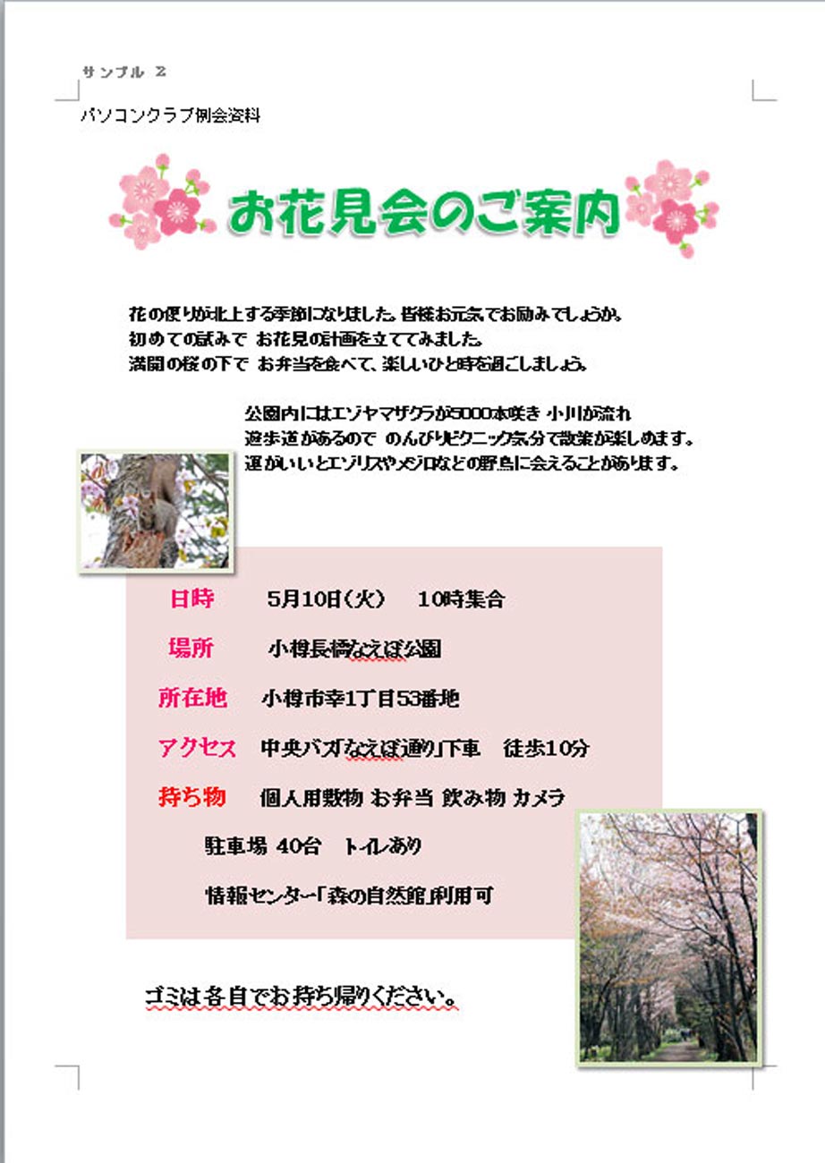 サンプル 1 word文書の文字を中心に 基礎的なことをします。サンプル1があまり戸惑わないで できるようになるといいですね。 投稿者川内恒子 投稿日2016/02/16(Tue) 15:59 No.72 サンプル 2 サンプル1が楽にできるようになったら イラストや写真を入れたり、図形を描く練習なども入れます。少し 見ごたえのある文書が作れるように 経験を増やします。テキストがあれば この程度の文書が作れる方は 今回はご遠慮ください。ただし 慣れていない人の優しいサポーターになってくれる人歓迎します。 投稿者川内恒子 投稿日2016/02/16(Tue) 16:08 No.73