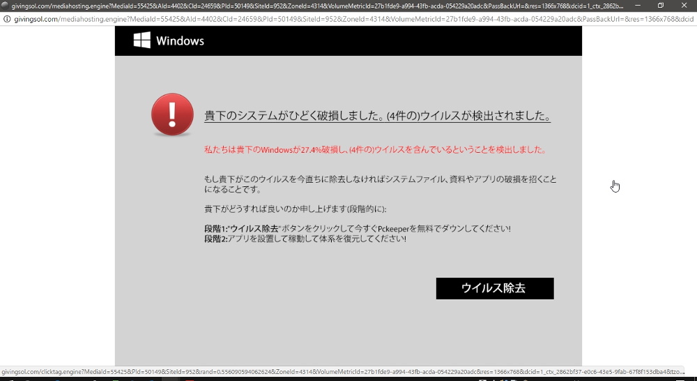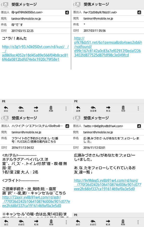 我々は狙われています その2 この画面も悪質です。左上に Windows のロゴマークの様なものがあり、実に恐ろしいことがかかれています。ウィルスに感染した自分のパソコンが上げた断末魔の悲鳴のようにもとれるので、すぐにでも『 ウィルス除去 』ボタンをクリックしたくなりますね。クリックしてはダメなんですよ! 絶体に クリック しないこと!!!この画面はもの凄く悪質で、画面上の全ての場所にリンク設定されおります。どこをクリックしてもどこかにリンクされてしまいます。注意してください。右上の 閉じるボタン≪ × ≫で画面を閉じてください。 投稿者134 谷村典彦 投稿日2017/03/17(Fri) 16:06 No.497 我々は狙われています その3 これは、パソコンではありません。私のスマホに来た良くないメールです。 数日に1回は入ります。よく注意してみると、件名や本文も変なのですぐ気が付くだろうと思います。絶対に 青い文字のリンク部分には触らないようにしましょう!スマホ乗っ取りウィルスがはやっていると聞いています。写真の例がそれかどうかは試していないので不明です。 絶対に 試してはいけませんよ!!! 投稿者134 谷村典彦 投稿日2017/03/17(Fri) 16:18 No.498