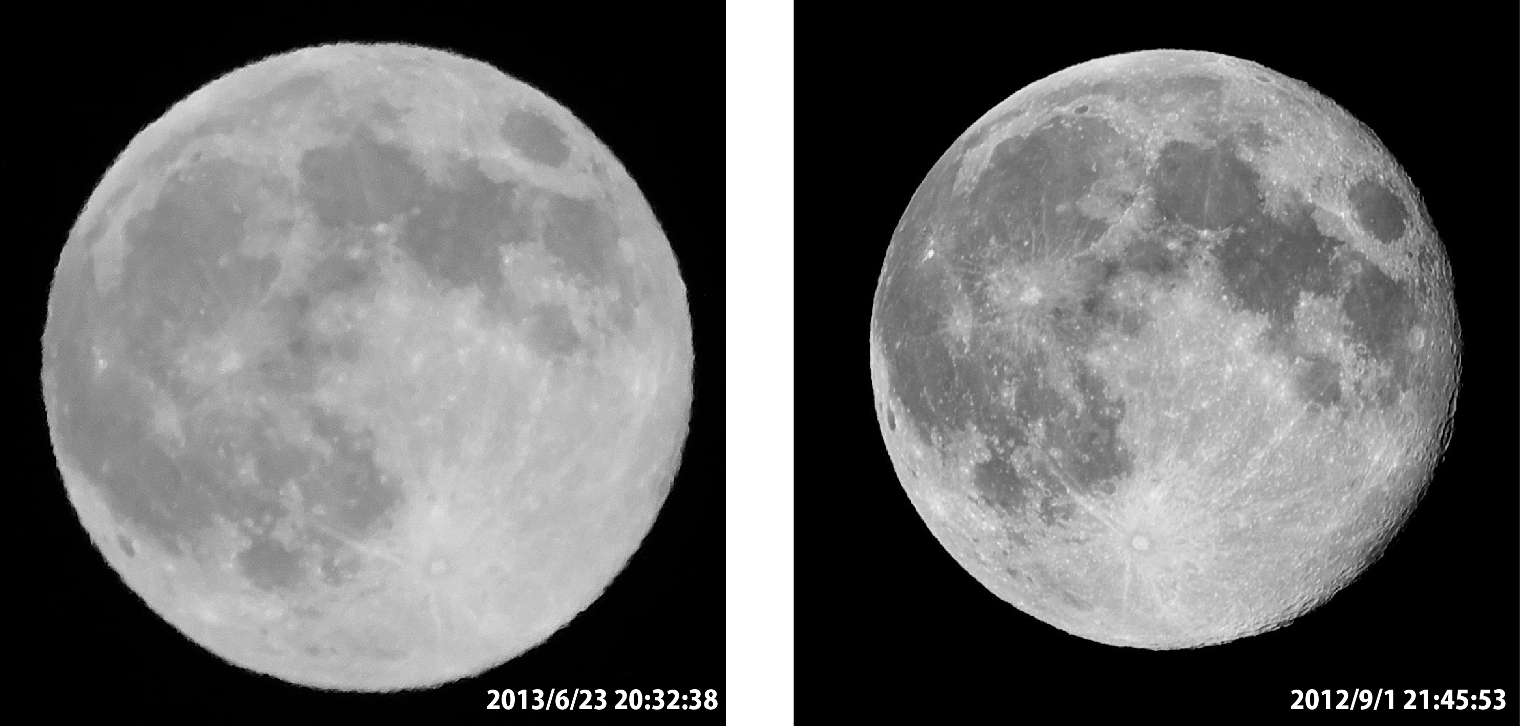 比較してみました。 『今夜6月23日20時12分に月が今年もっとも地球に近づき、20時32分に満月になる』という20:32に撮影し昨年撮影したものと比較してみました。鮮明さでは昨年秋に撮ったもののほうが格段に良いですね。昨日は月の位置も低く大気のゆらぎのせいか不鮮明です。残念。以下はあるネットの記事です。スーパームーンは、楕円軌道を回る月が地球に近づいたために起きる現象で、ほぼ年に1回観測される。23日午後8時すぎに月と地球の距離が約35万7千キロと今年最も近づき、満月のタイミングとも重なったため、スーパームーンとなった。 米航空宇宙局(NASA)によると、通常の満月に比べて大きさが14%、明るさが30%増すという。<クリックすると大きくなります> 投稿者佐藤和春 投稿日2013/06/24(Mon) 05:19 No.390