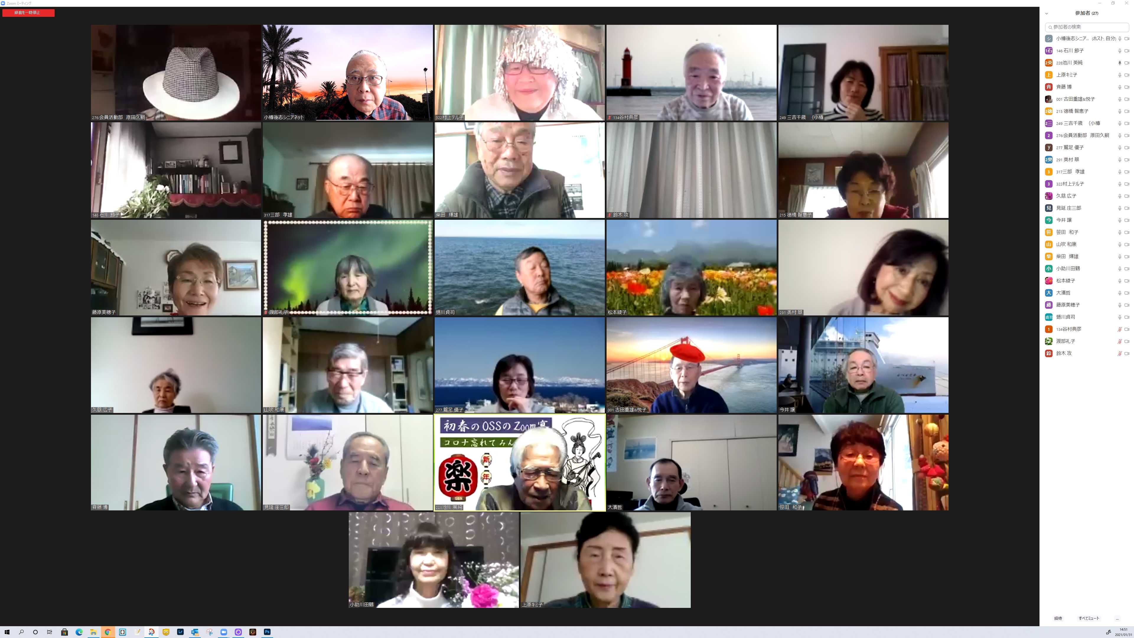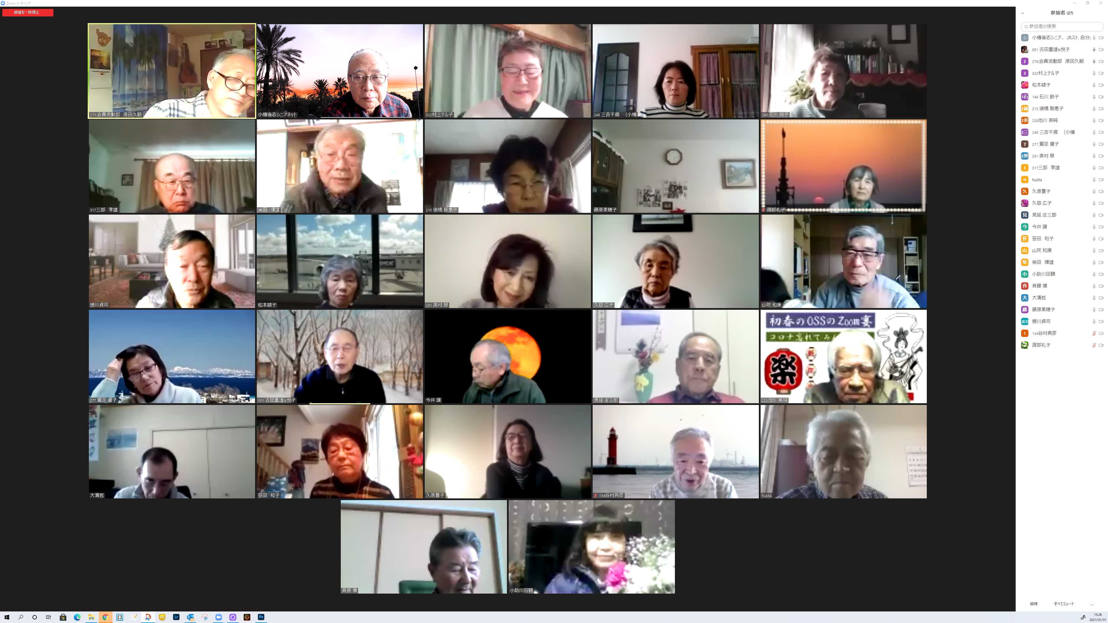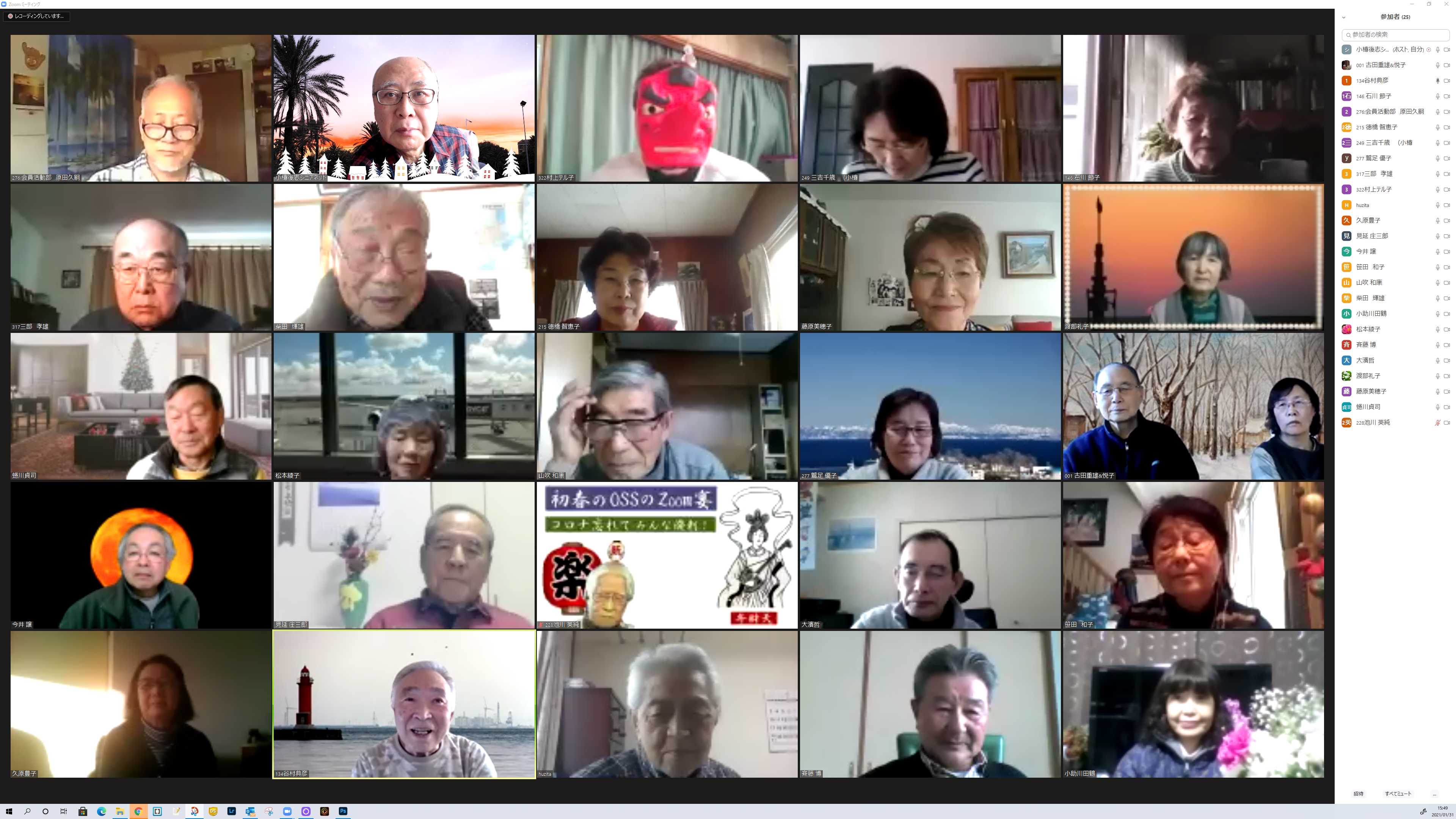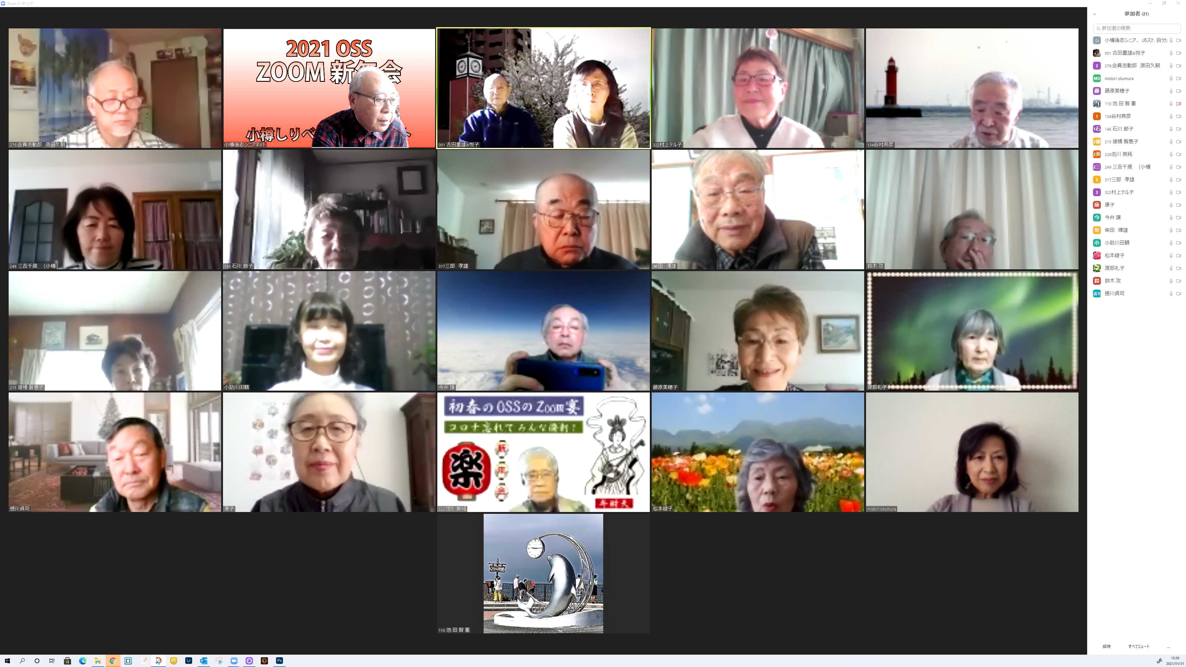 会場 クイズに考えてます 投稿者原田久嗣 投稿日2021/02/01(Mon) 10:32 No.222 会場風景 お顔を見れて嬉しいな! 投稿者原田久嗣 投稿日2021/02/01(Mon) 10:34 No.223 新年会画像 閉じこもりの日々、安否確認かたがた元気そうなお姿に感動です 投稿者原田久嗣 投稿日2021/02/01(Mon) 10:38 No.224 新年会入賞者発表。 OSS三役による厳正なる審査の結果 貴殿にはOSS、ZOOM新年会に於いて会を盛り上げて頂きましたので感謝を申し上げここに表彰致します。☆最優秀賞 藤原美穂子様、三吉千歳様 クイズ正解多数あり☆審査員特別賞 池川英純様 バックの背景に歴史と風情を絡め、ZOOM新年会の俳句を作って頂いた。☆殊勲賞 見延庄三郎様、久慈広子様、石川節子様、渡部玲子様 ZOOMに一生懸命取り組む姿が素敵だった。☆技能賞 古田重雄様 札幌で鍛えた技を存分に発揮され着せ替えやメンバーへのレクチャーに貢献して頂いた。☆ほのぼの賞 古田重雄、悦子様ご夫妻。伊藤健也、八重子ご夫妻。山吹和康、妙子様ご夫妻(お孫さん入り)夫唱婦随の姿が眩しかった。☆敢闘賞 川横康子様、鈴木攻様、上原公子様〜機器のトラブルでお声が聞けなかったり、入場に対してお声を聞けなかった…残念無念!でした。以上表彰させて頂きます。有難うございました。 投稿者原田久嗣 投稿日2021/02/01(Mon) 20:26 No.225